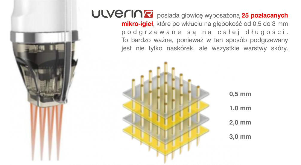 Zabiegi RF mikroigłową polegają na jednoczesnym mikronakłuwaniu i podgrzewaniu skóry za pomocą fal radiowych. Głowica ULVERIN R zakończona jest jednorazową, sterylną nakładką wyposażoną w 25 mikroigieł, które po wkłuciu podgrzewane są do temperatury 45 – 60 stopni Celsjusza. Kiedy przykładamy głowicę do skóry, igły wbijają się na zaprogramowaną głębokość, po czym wysyłany jest impuls elektromagnetyczny podgrze wający skórę. W ten sposób w przeciwieństwie do zwykłej radiofrekwencji, podgrzewana jest nie tyle powierzchnia skóry, lecz jej wszystkie warstwy na zadanej głębokości – od 0,5 do 3,5 mm (możliwość precyzyjnej regulacji). Powoduje to remodeling, pobudza do produkcji kolageny i elastyny w skórze, a w efekcie pozwala osiągnąć przestrzenny efekt ujędrnienia skóry.